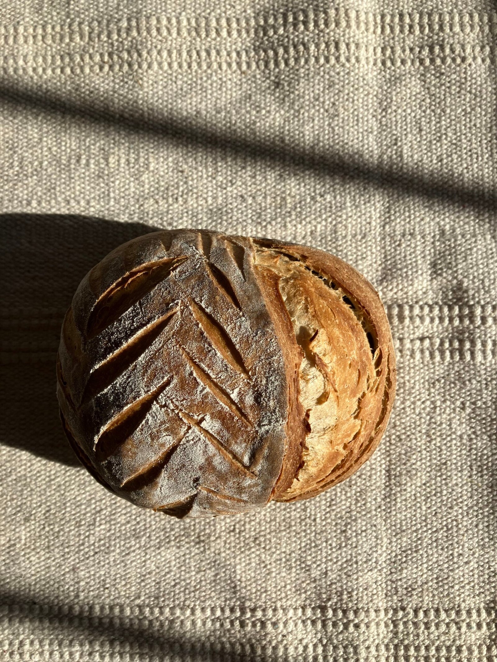 This round sourdough loaf is the perfect bread for soups, sandwiches and more! It is crafted with a crisp crust and its center is soft and tangy. Local pickup on 11/26.